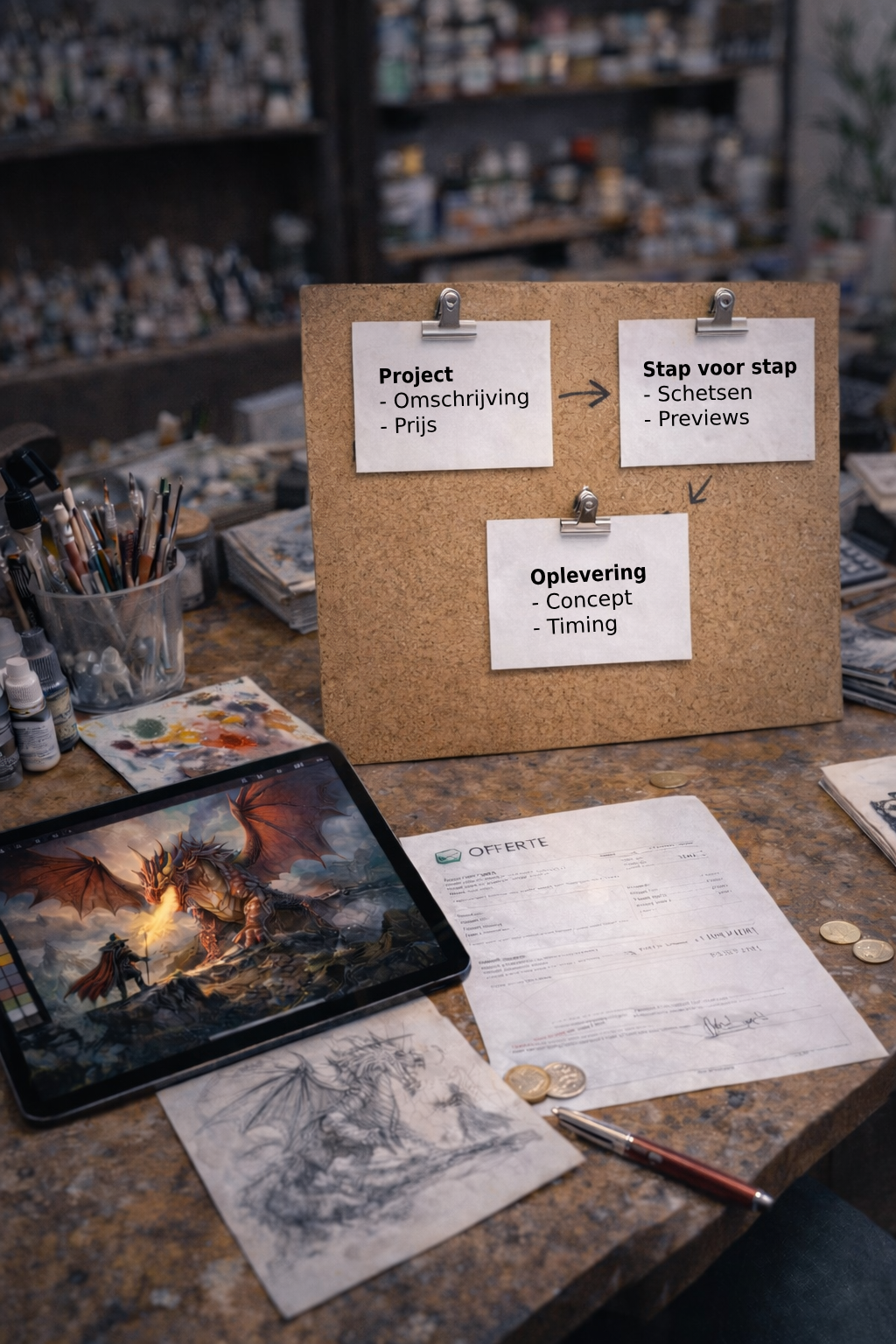 Het proces start met een vrijblijvend contactmoment, waarin we uw idee bespreken, de haalbaarheid inschatten en advies geven. Op basis hiervan ontvangt u een duidelijke offerte met projectomschrijving, prijs (excl. btw) en timing, 14 dagen geldig. Bij akkoord wordt een voorschot van 40% gevraagd, waarna de uitvoering start. Het project wordt stap voor stap uitgewerkt, met schetsen of previews en tussentijdse opvolging, altijd met respect voor het afgesproken concept en de timing.