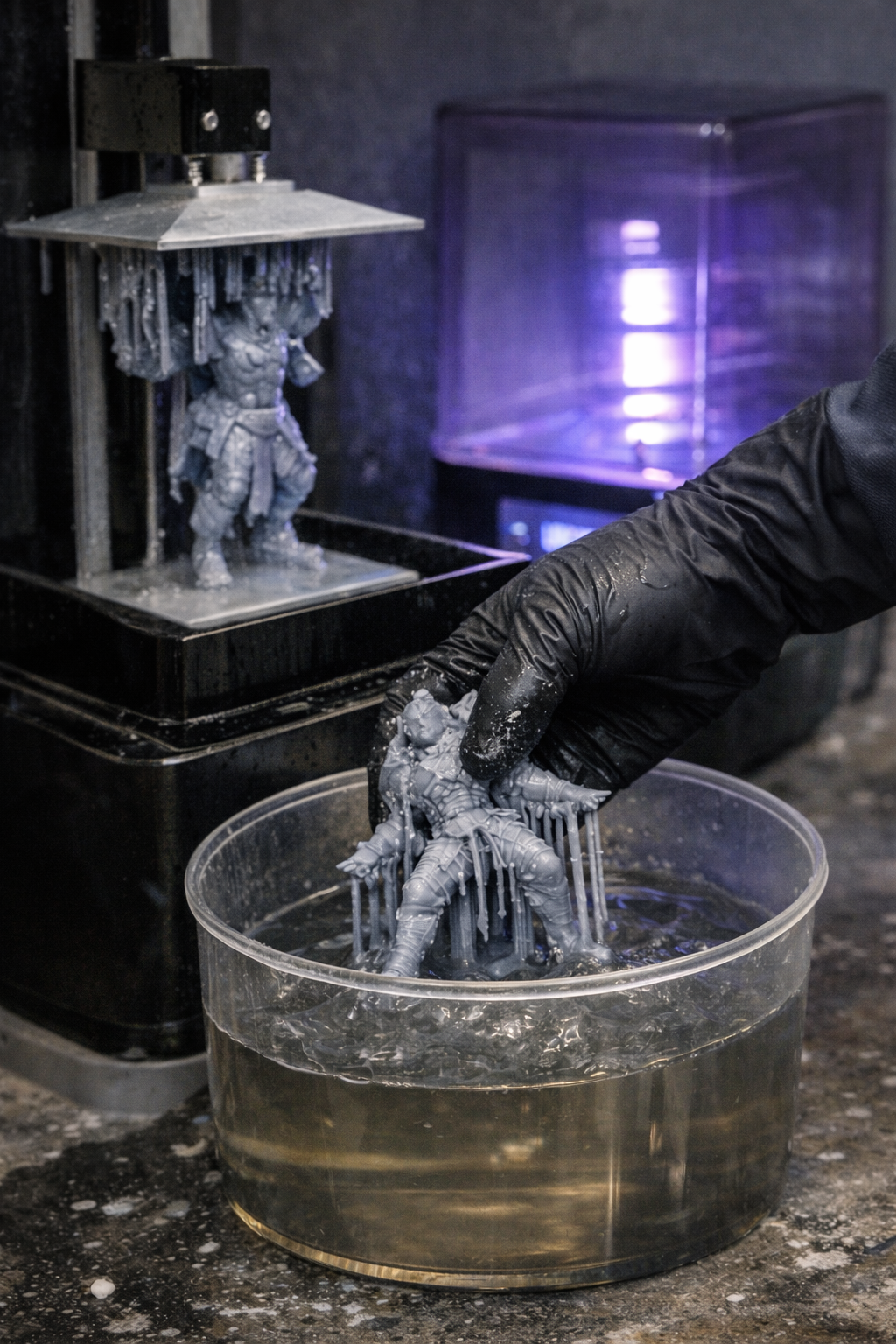 Direct na het printen wordt de figurine zorgvuldig gereinigd in isopropyl alcohol. Dit verwijdert overtollige hars en zorgt ervoor dat het oppervlak zuiver en stabiel wordt. Daarna volgt het gecontroleerd uitharden, zodat het materiaal zijn definitieve sterkte en structuur krijgt.