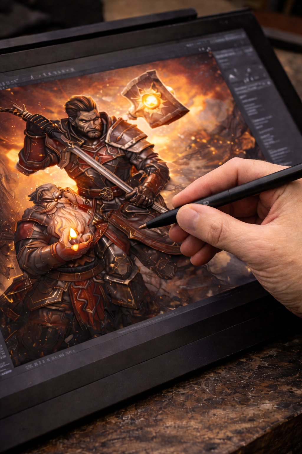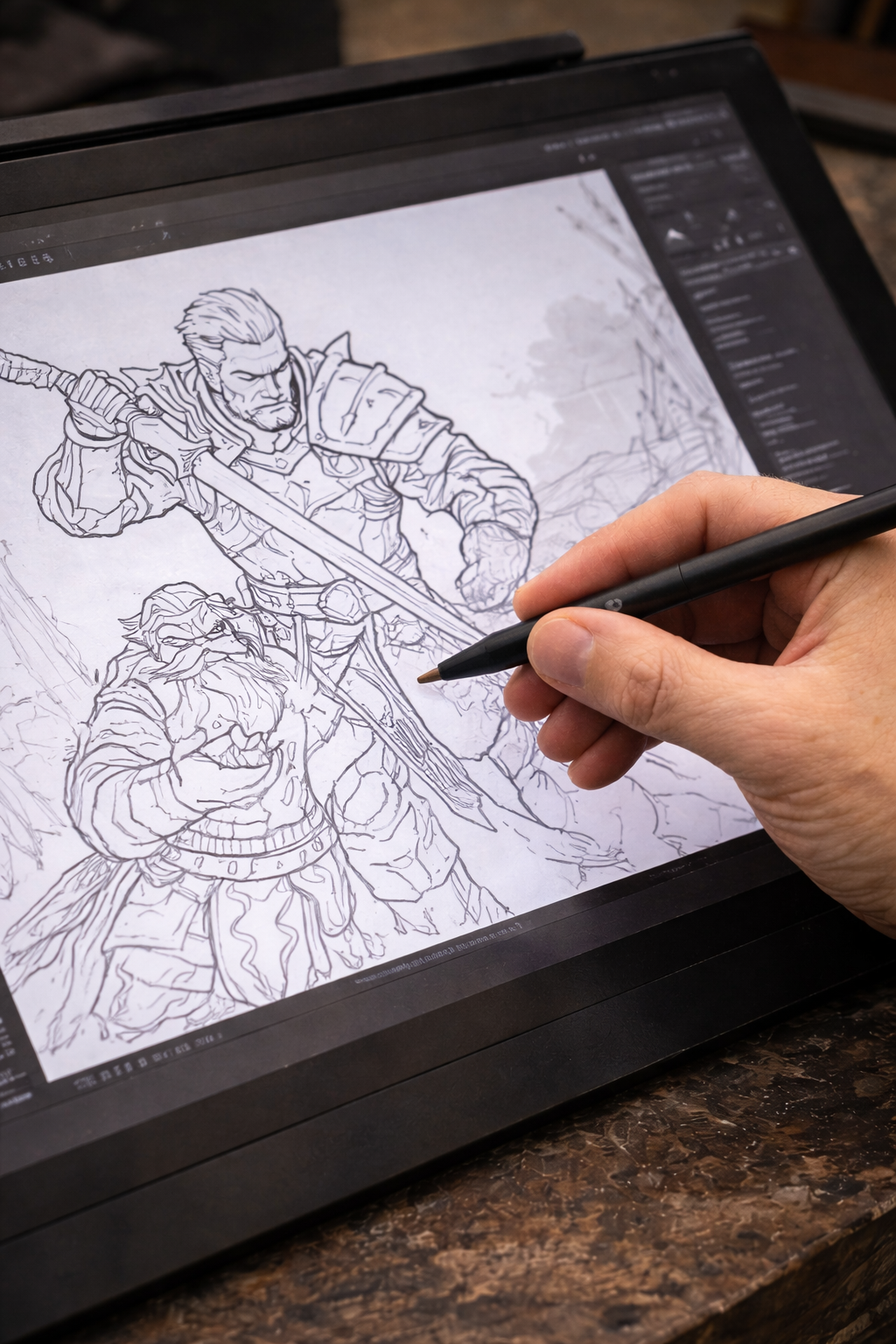 Elke digitale illustratie bij Brush Hour begint met een idee — soms vaag, soms al scherp omlijnd. Het is onze taak om dat idee te vertalen naar een visueel verhaal dat klopt in sfeer, compositie en detail.