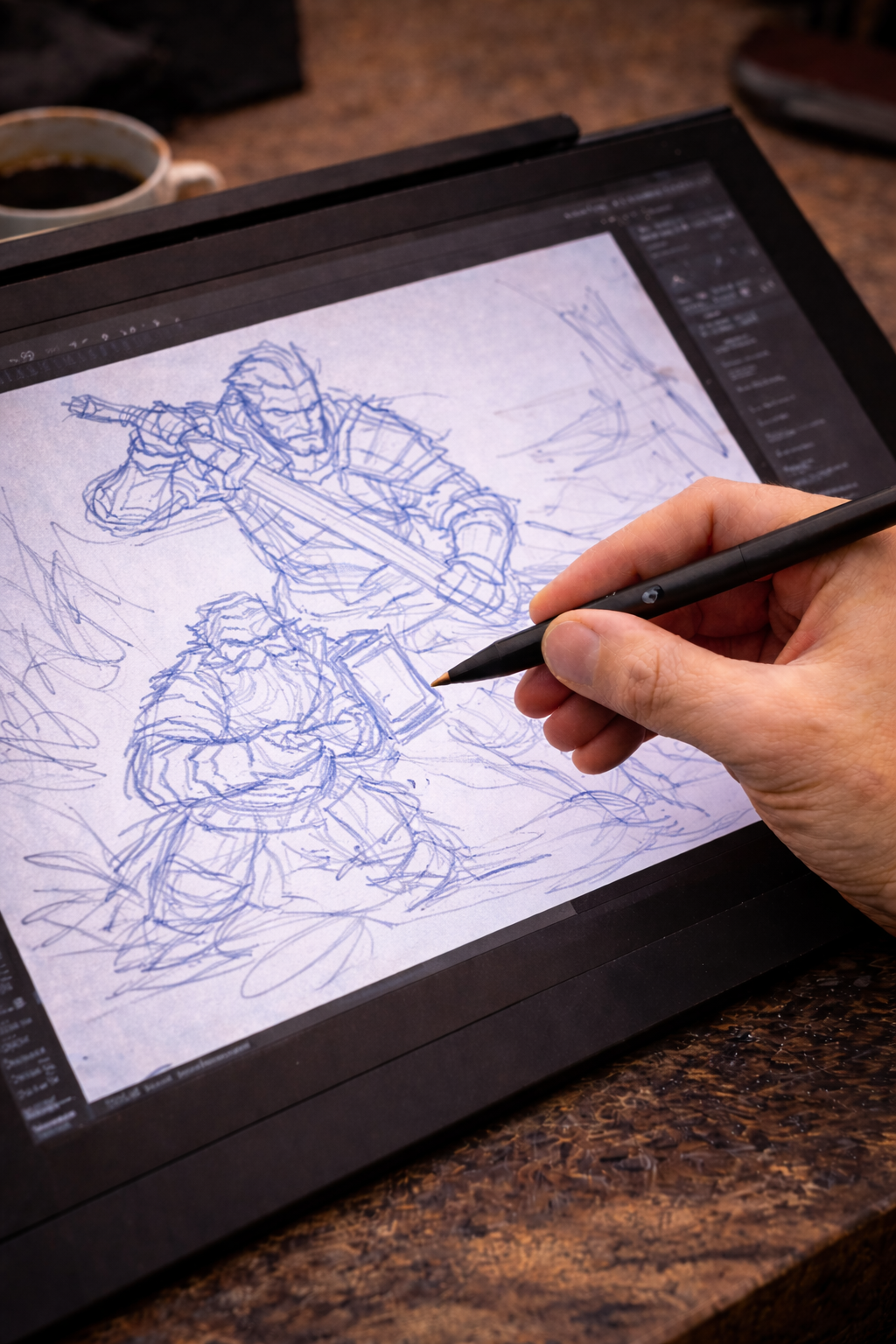 Op basis van het concept maken we één of meerdere ruwe schetsen. In deze fase ligt de focus op compositie, vorm en balans — niet op detail. We zoeken naar een sterke beeldtaal en een duidelijke leesbaarheid van het ontwerp.